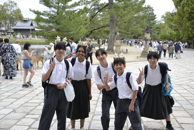 奈良に到着後は、全員で奈良公園へ。道中では、鹿に癒される生徒もいれば、少し怖がる生徒も。鹿の多さに思わず驚く姿も見られました。