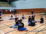シッティングバレーボールとは、パラリンピック競技の1つであり、下肢などに障がいのある選手が座ってプレーをするバレーボールで、でん部を床についたまま競技を行います。