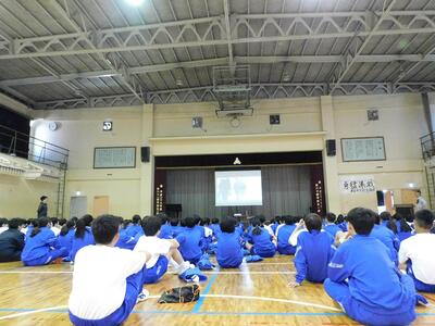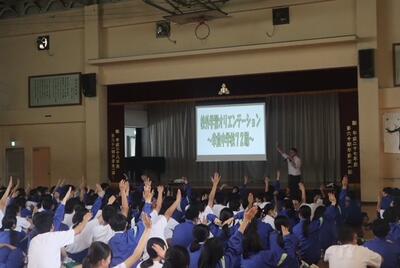 昨日10日(水)に体育館にて、新入生オリエンテーションを行いました。中学校での委員会の紹介と部活動の紹介を動画で作成し、視聴しました。どの動画も魅力あるもので、1年生も楽しく観ることができました。